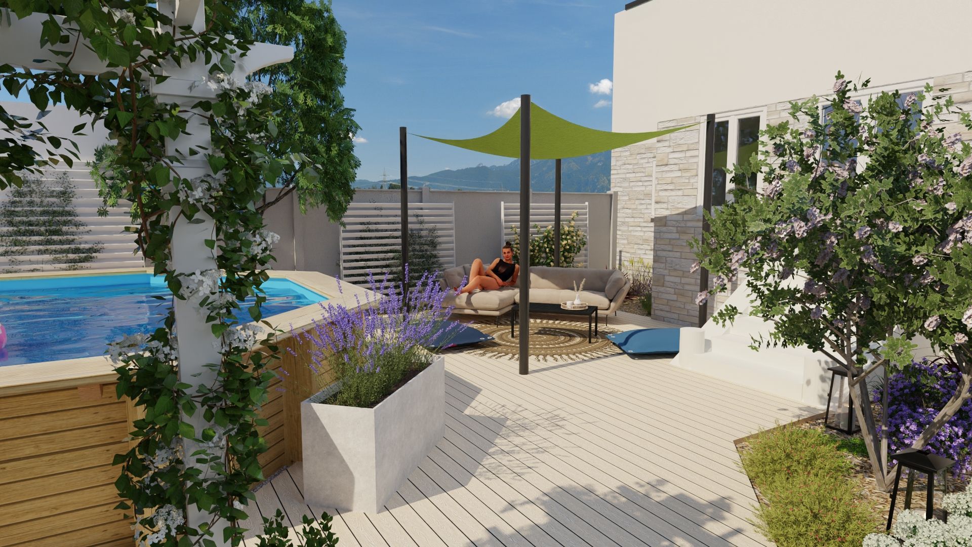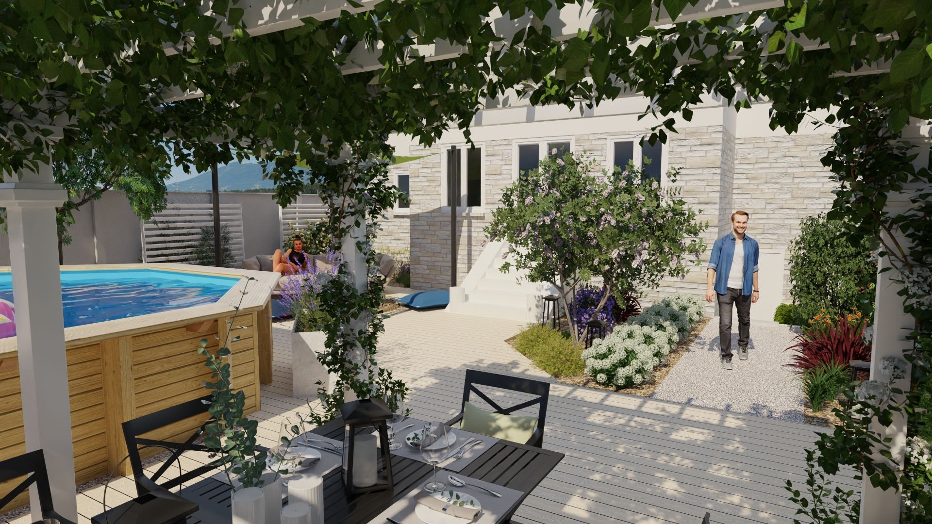 Les rendus 3D ont permis de peaufiner l’agencement et les choix esthétiques avant réalisation. Le jeu d’ombre et de lumière sous la pergola, la sélection de matériaux nobles et l’intégration subtile de la végétation créent une ambiance unique et chaleureuse, idéale pour se détendre et recevoir des invités.