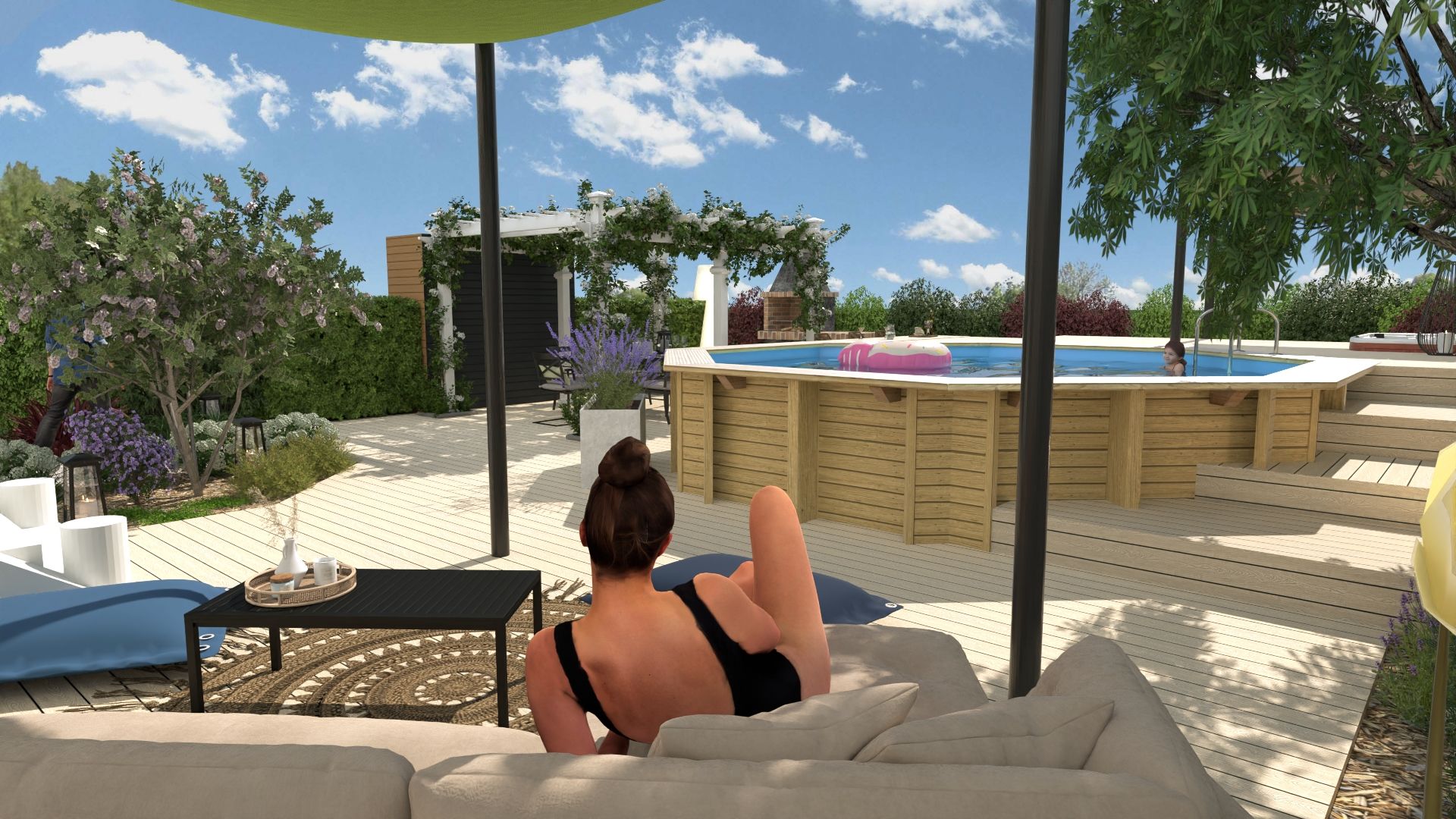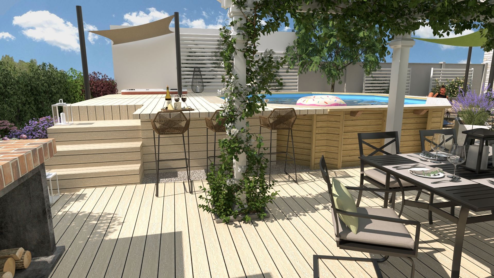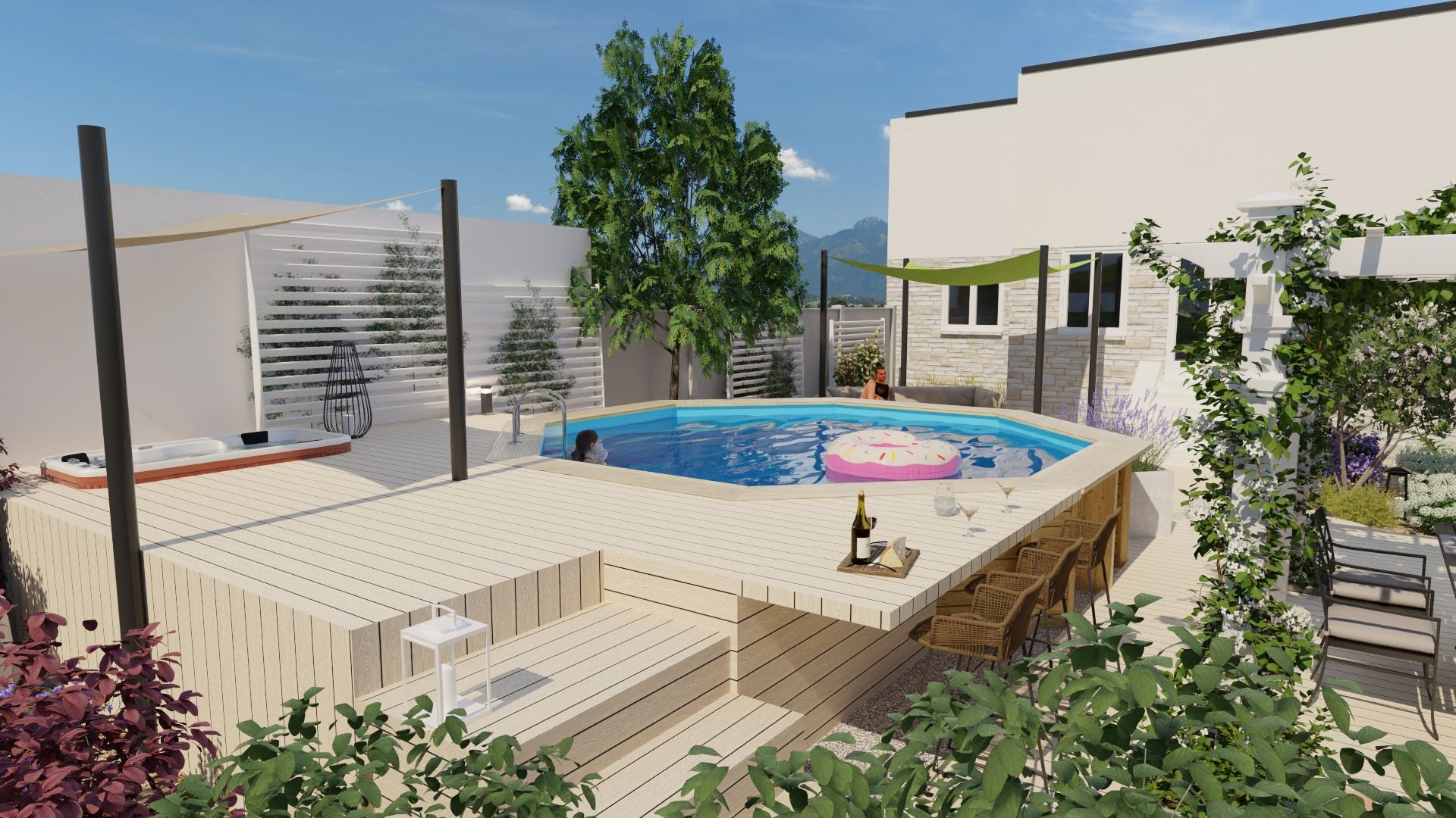 une terrasse en bois élégante, une piscine surélevée et un espace détente sous pergola. Pensé pour offrir