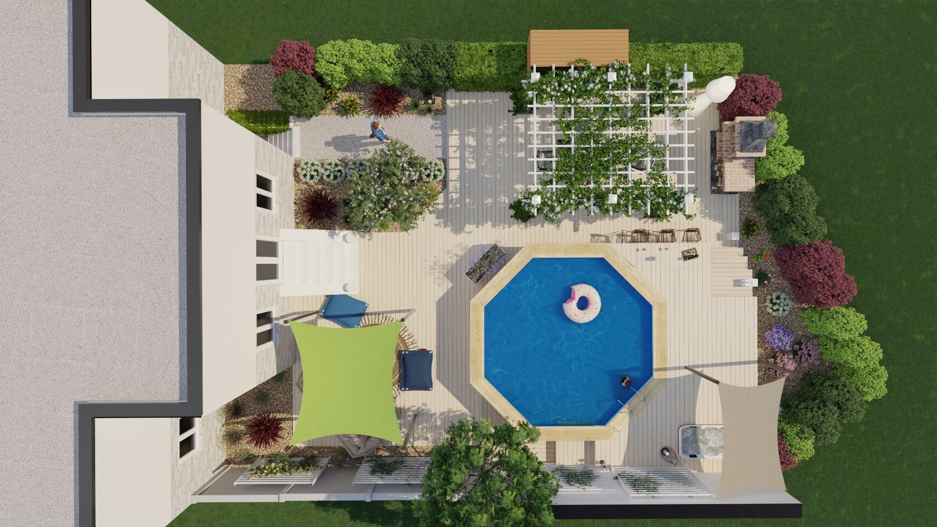 Plongez au cœur du projet grâce à des photos avant/après illustrant la création d’une terrasse chaleureuse, l’installation d’une piscine surélevée et l’aménagement d’un coin détente sous pergola.