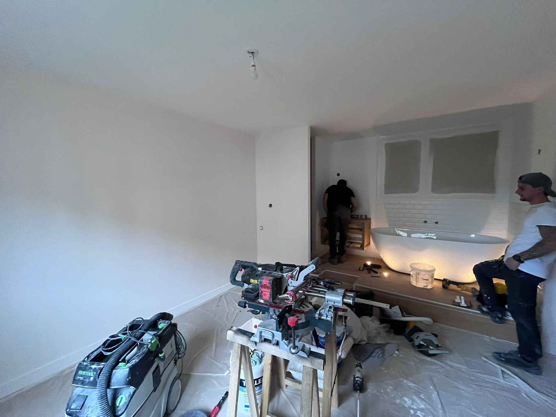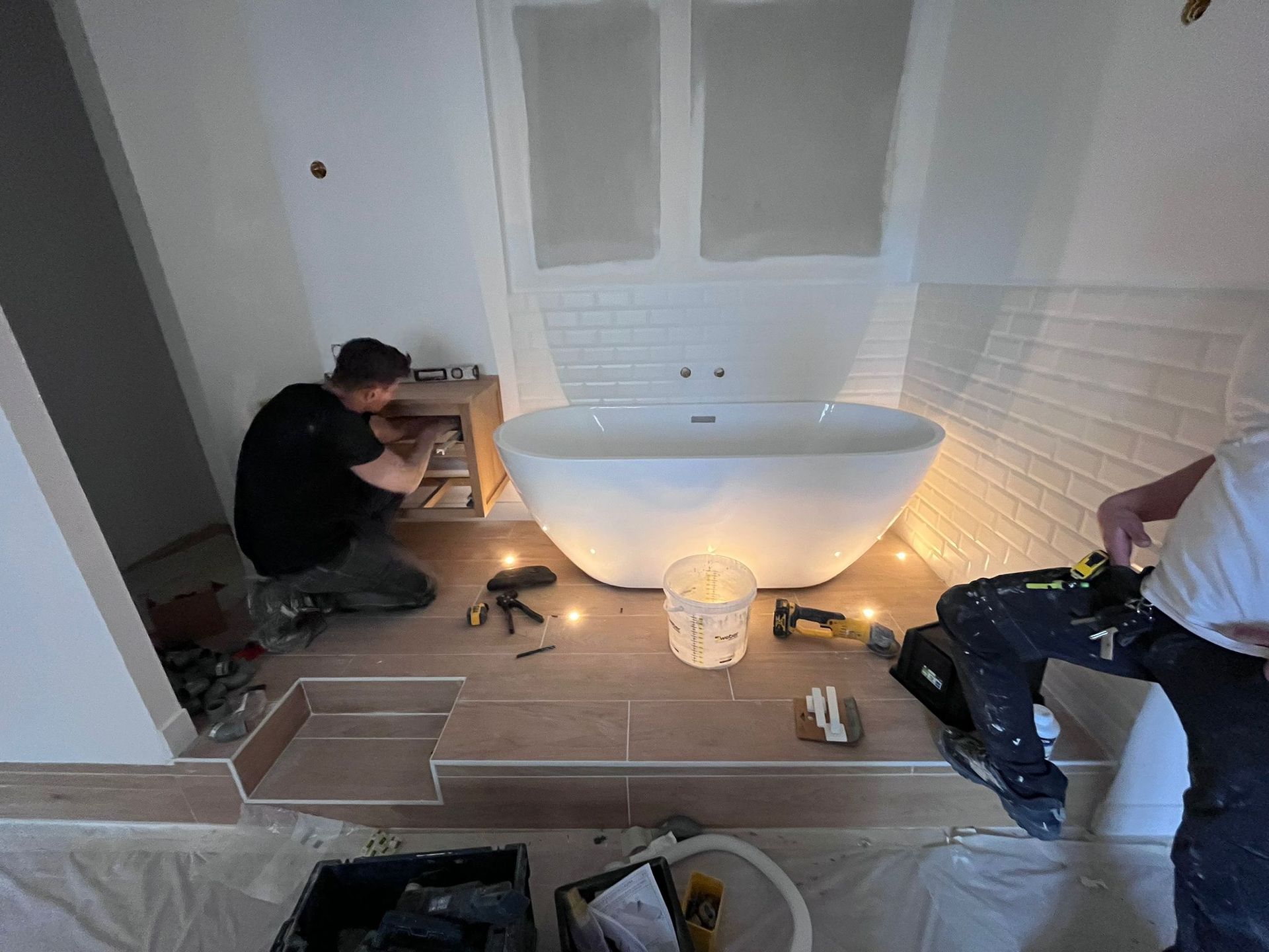 La baignoire îlot, véritable pièce maîtresse du projet, s’intègre parfaitement à l’ambiance douce et raffinée de la chambre. Les finitions ont été soignées, les choix décoratifs respectés, et le résultat est à la hauteur des attentes : un espace unique, chaleureux et propice à la détente.