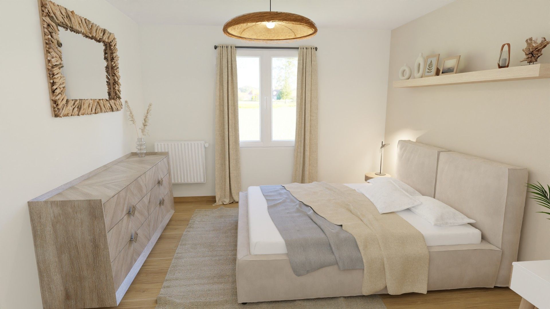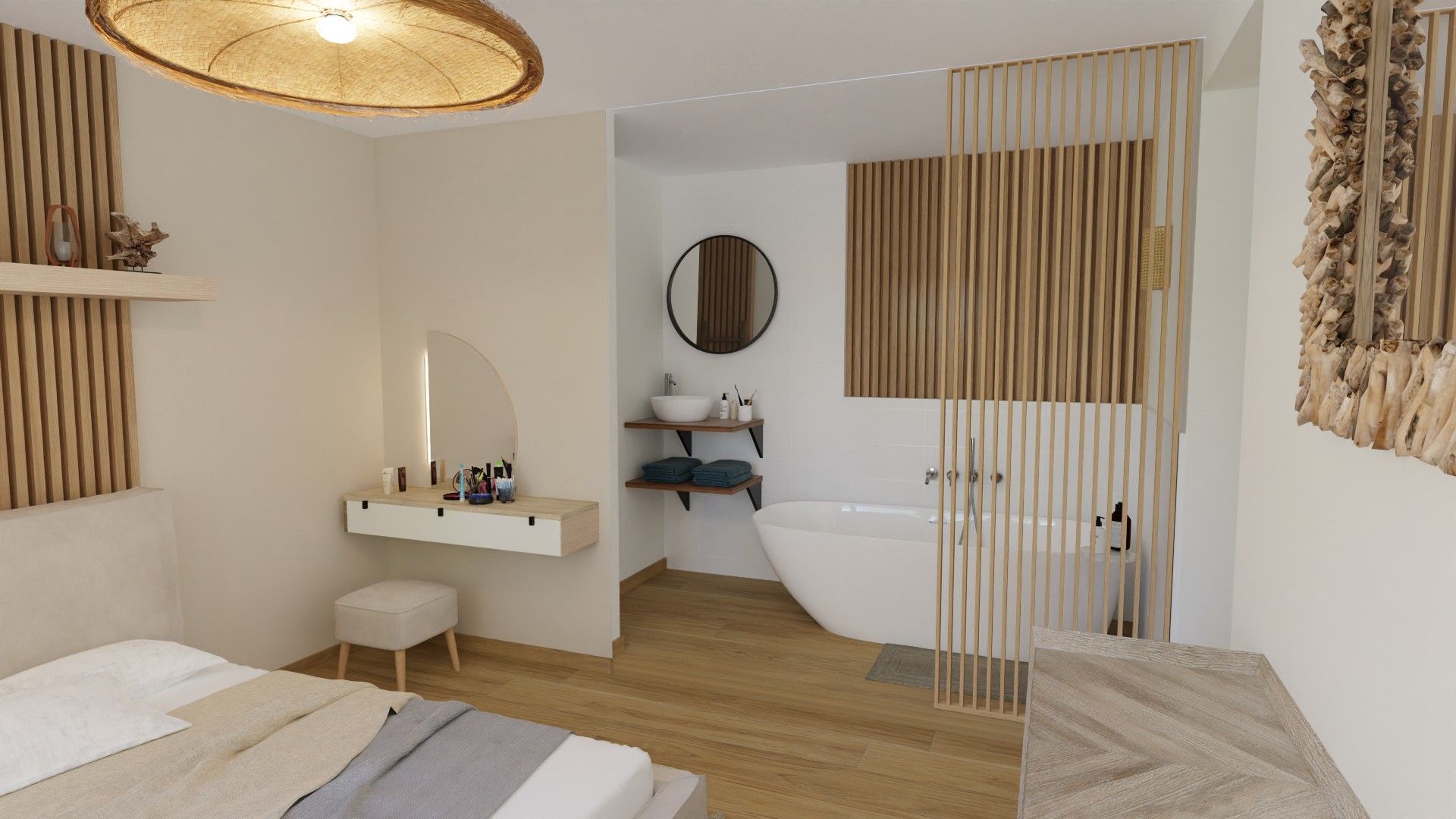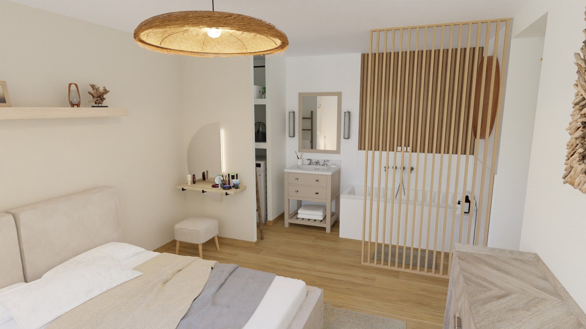 Ce projet avait pour objectif de transformer une chambre classique en un espace de vie élégant, confortable et unique, en repensant totalement sa configuration. L’idée principale était d’ouvrir l’espace en supprimant deux pièces existantes pour y intégrer une salle de bain avec baignoire îlot, directement ouverte sur la chambre.